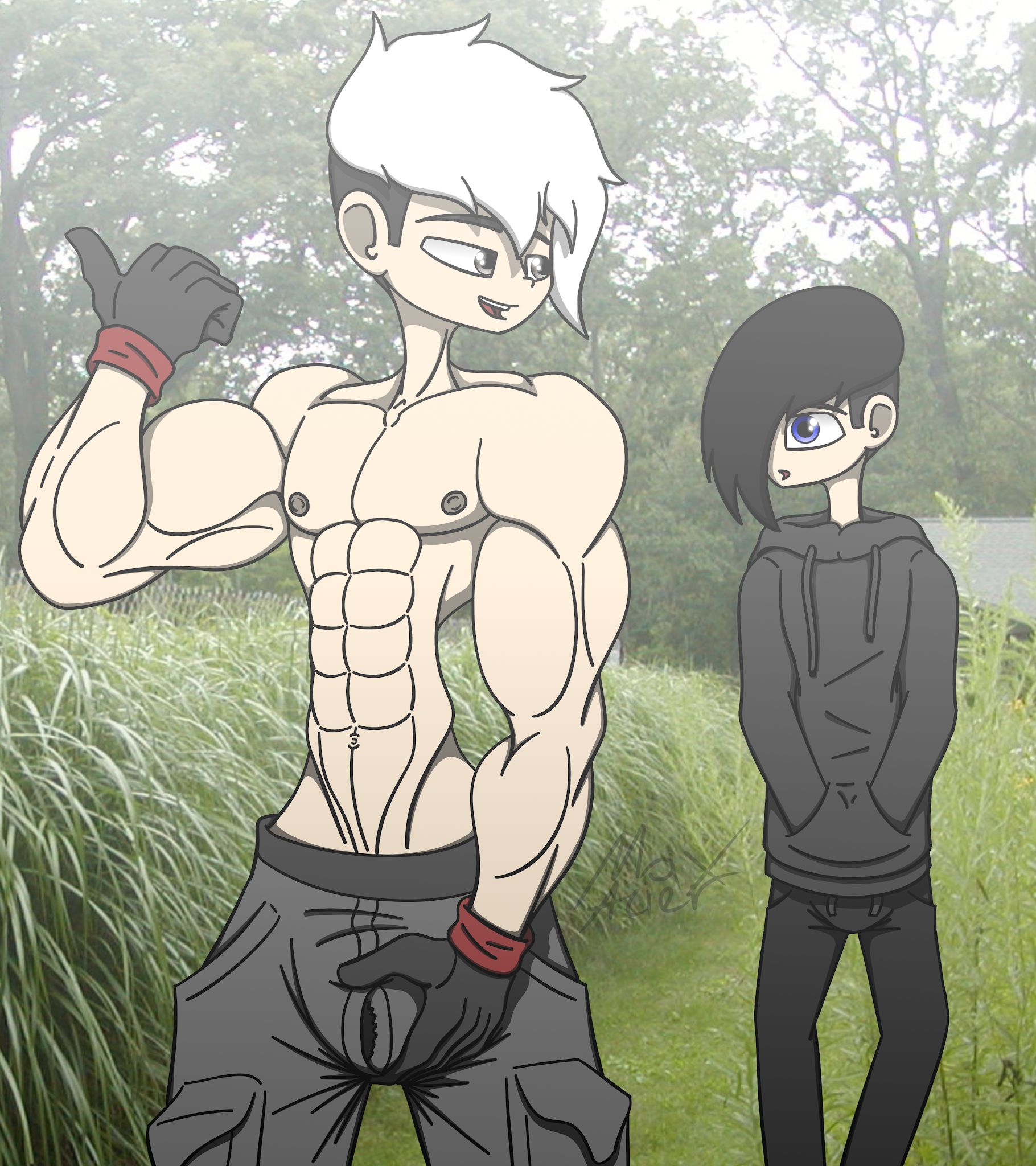 The job starts witht he rock bag, and Julian and Dominik start off carrying the rocks to the west side of the garden. They were fairly hefty since being rocks but Dominik didnt necessarily want to show a sign of a struggle trying to keep his little ego out and apparent he hefted the bags of stone toward the plot of land. Cutting open the bag with a pair of knives Julian had out for this job, they cut it open and dumb the bundles of rocks into the spot before having to go back for another trip. With three bags left Julian outstretched to reach one of them but Dominik rushed forward to grab the extra 3rd. “D-dont worry i got it!” Domink shouts excitedly but with a bit of a struggle the holding of those two rock bags an immense strain. “Oh… uh sure…” Julian says clearly seeing him struggle but was eagerly impressed and moved, and a bit aroused as well seeing Dominiks muscles move to get ready to carry those bags. “…If you need help just ask i still got a free hand.” Julian states as he begins to walk onwards to the plot. Dominik nods with heavy breaths as he sorta struggles to carry the two rock bags in one arm each. He makes it just after Julian, as the loud was heavy sweat began sliding down Dominik’s body but he was ever eager to please with his ego and the contentment of doing such a good job. After setting up the rocks in the plot of land they begin to get to the mulch, both taking two bags each to begin the spread around certain places around the flowers and dumping them into them. Altho mulch wasnt as heavy as the rocks they were still a weight worth dealing with. Julian was meticulous with his placement of the mulch around the flowers as he pats the ground but he glances to the side to see Dominik a bit more energetic with it as he tears the bags and dumps out the mulch. Julian watches as he gets to work and it was pretty attractive as he slowed down to watch his near sweat glistened body, as his short-sleeved shirt show off those fit biceps and that hint of pecage as he works hard and eagerly. Dominik turns to Julian with a smile, “you tiring out big guy?” he asks, snapping Julian out of his minor trance before he continues, “Im just being more detailed than you is all, gotta make the garden look nice.” Julian says pointing out the sloppy handiwork of Dominik. The light jab ignited a bit of gruff in him and he turns away. “Well then let me make it neater and nicer than you!” Dominik announces the low blow to his ego needing to be filled with outplaying Julian. Its not long after the two finish placing down the mulch and putting some of the weeds in the yard into the foliage bags.